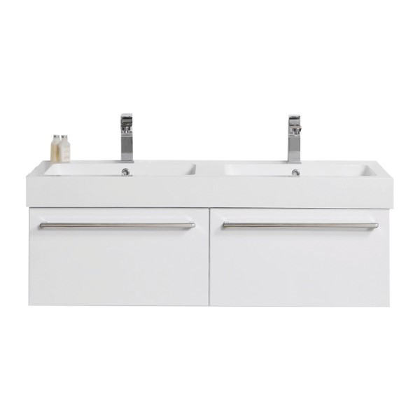 The Raymor Tessa 1200 Series 2-Drawer Double Bowl Vanity in white gloss finish, is suitable for all types of bathroom. This wall hung vanity measures 1200 mm x 425 mm x 450 mm. It comes with clean polymarble top and the soft close drawers that are elegantly designed. It features side-by-side drawer configuration.